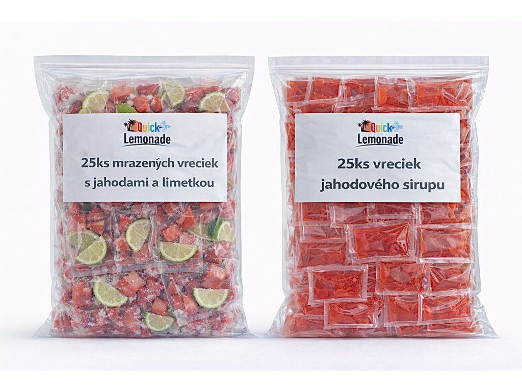 Balenie: Set obsahuje balenie 25 vreciek mrazeného ovocia po 65g (jahoda + citrón) a balenie 25 vreciek so sirupom po 40 ml s príchuťou jahoda.