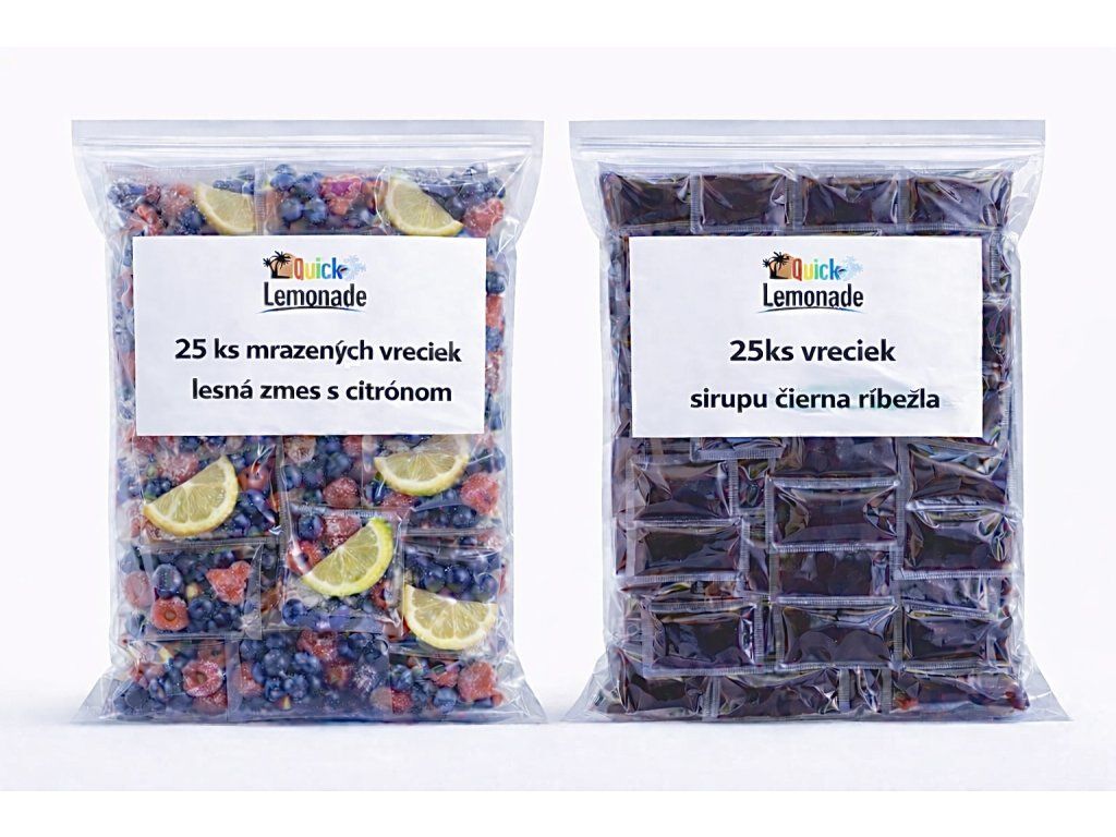 Balenie: Set obsahuje balenie 25 vreciek mrazeného ovocia po 65g (lesná zmes + citrón) a balenie 25 vreciek so sirupom po 40 ml s príchuťou čierna ríbezľa.